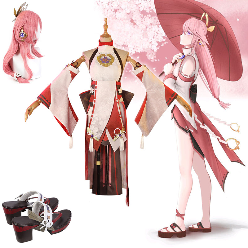 Genshin Impact Yae Miko Cosplay Costume Yae Miko Wig Shoes Anime Game Pink Uniform