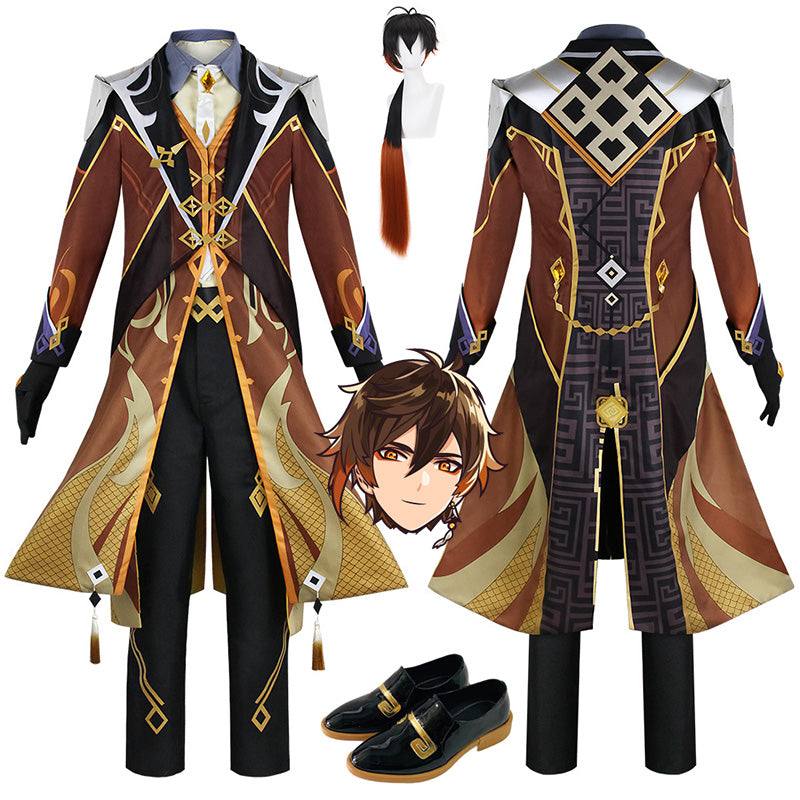 Genshin Impact Zhongli Cosplay Costume Anime Morax Brown Suit Wigs Shoes