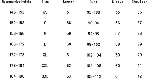 | Size | Height | Bust | Waist | Hip | Shoulder |